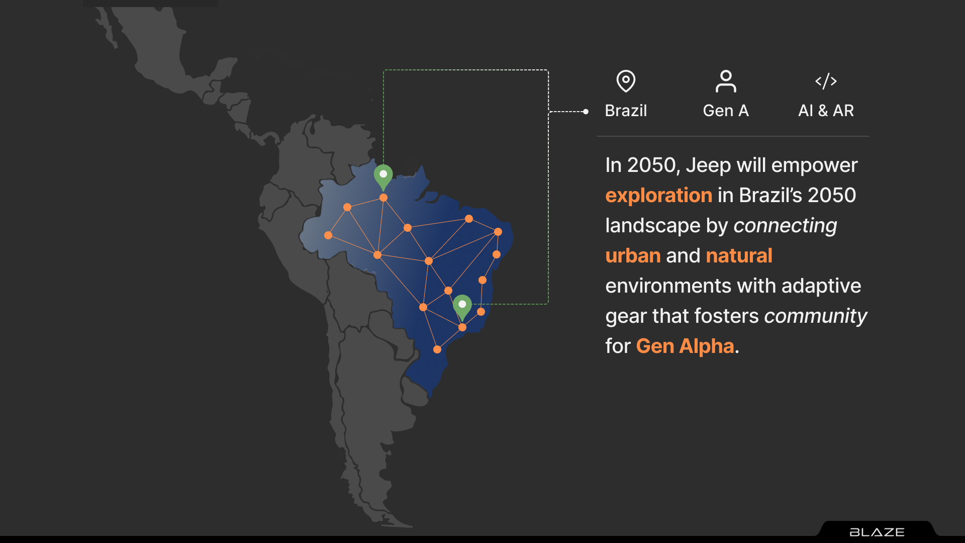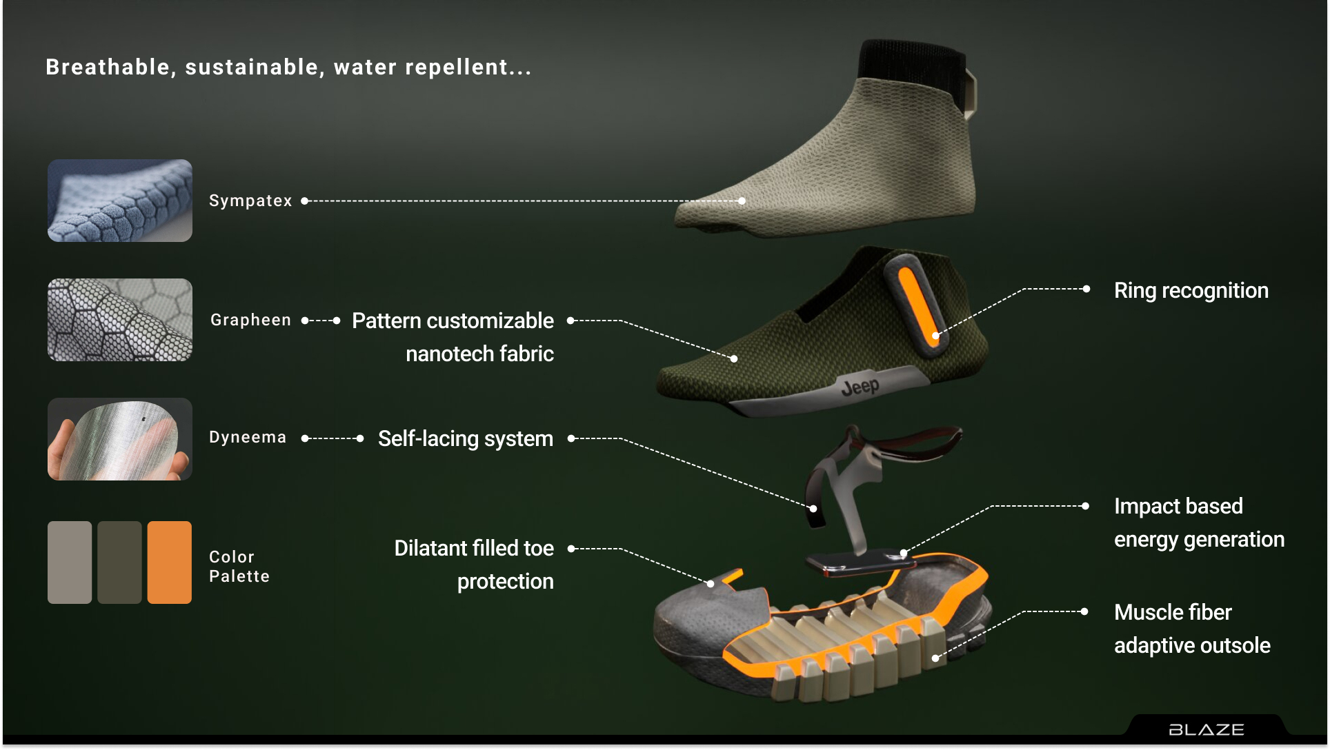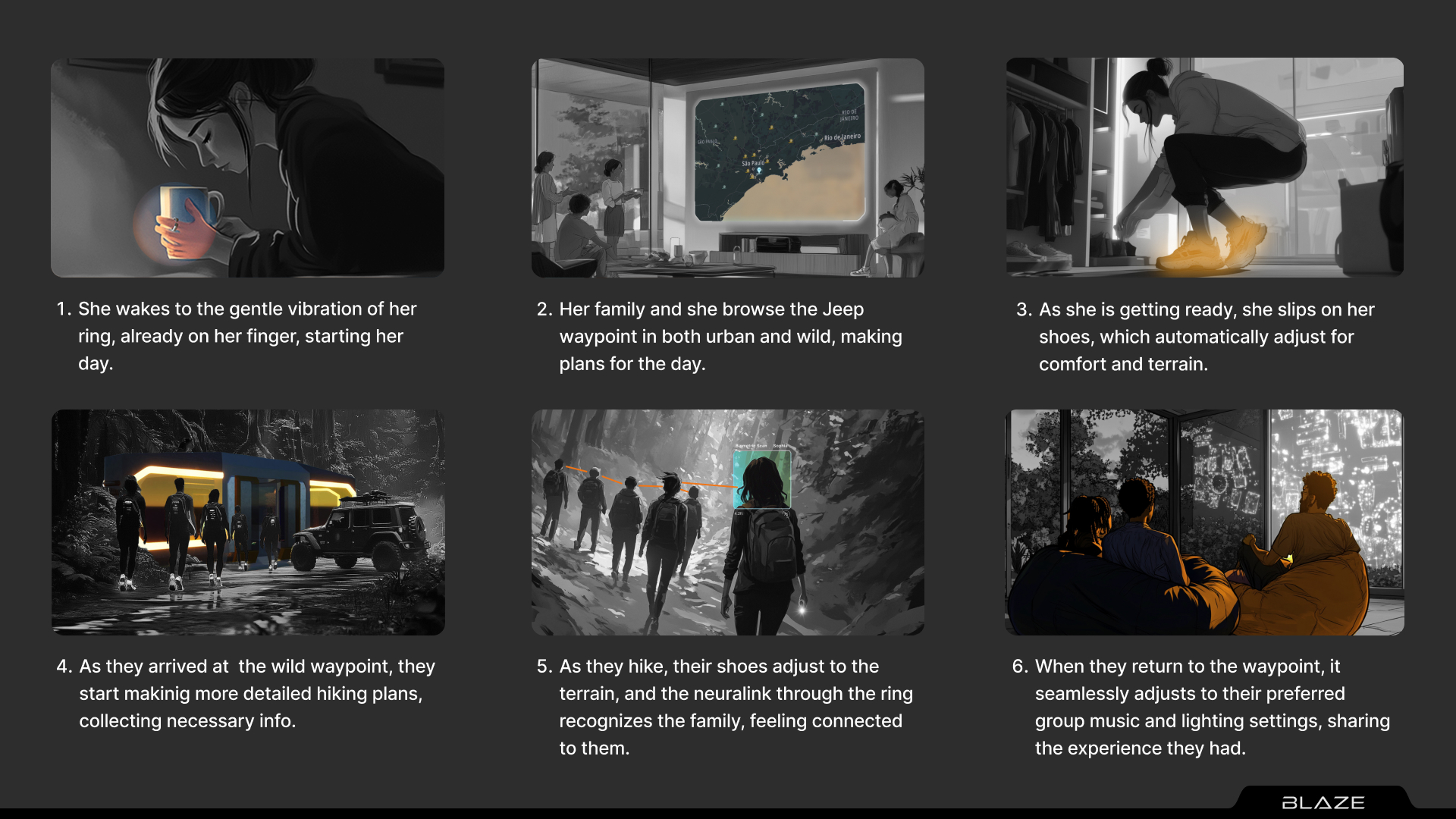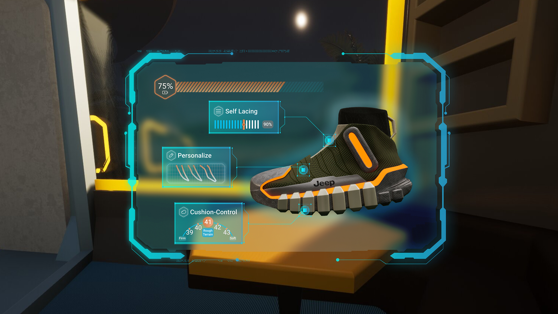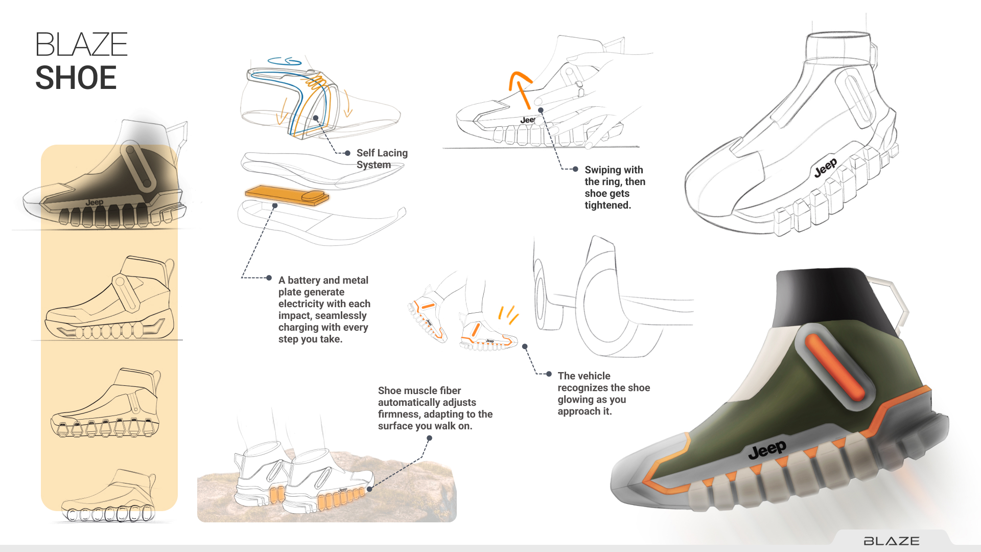 In 2050, The disconnect between hikers and their vehicles would limit the potential of exploration. A hiking boot that communicates with the Jeep, offering personalized settings and on-the-go adaptability, can transform the relationship between adventurers and their gear.